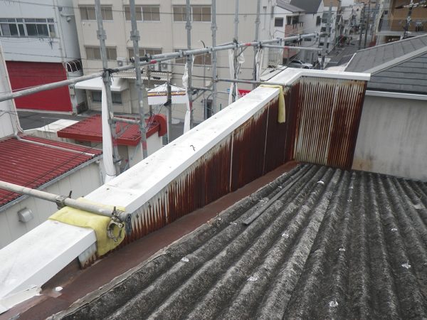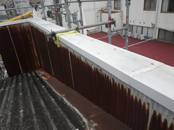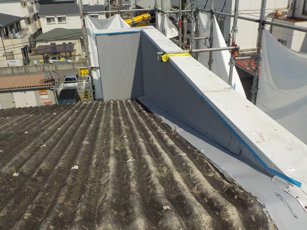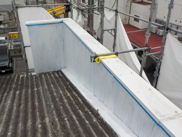 屋根の立上げ部に足場を組んで養生をしているところです。