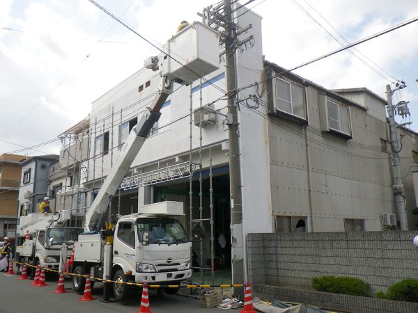 工事のスケジュール上、足場の組み立てと関西電力の工事日程が被ってしまったため、合間を縫って工事していただきました。