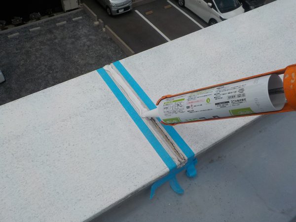 笠木ジョイント部と外壁パネル目地部にシール処理を施工しているところです。
