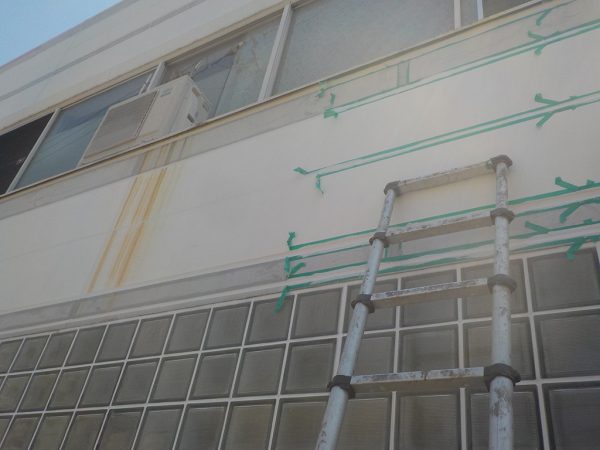 作業員は落下しないよう安全面に配慮すること、道路に面した場所なので、マスキングテープを剥がした時に細かい塵が飛び散らないように慎重にテープをはがすことが注意点です。