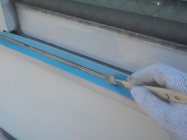 シール材を施工する前に、刷毛で掃いて清掃したりプライマーを塗布したりといった下準備を行っていきます。
