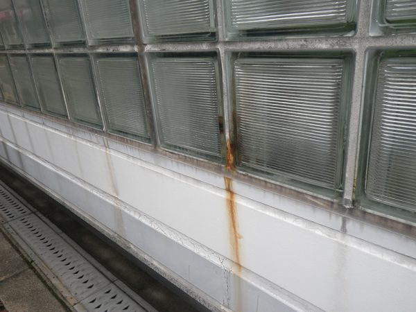 漏水によってサビと水が混ざったものがガラスブロックから流れている状態です。