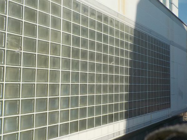 外壁はパネルとガラスブロックで覆われているもので、パネルのジョイント部のシーリングの劣化や破損、ガラスブロックの目地部の破損が見られます。