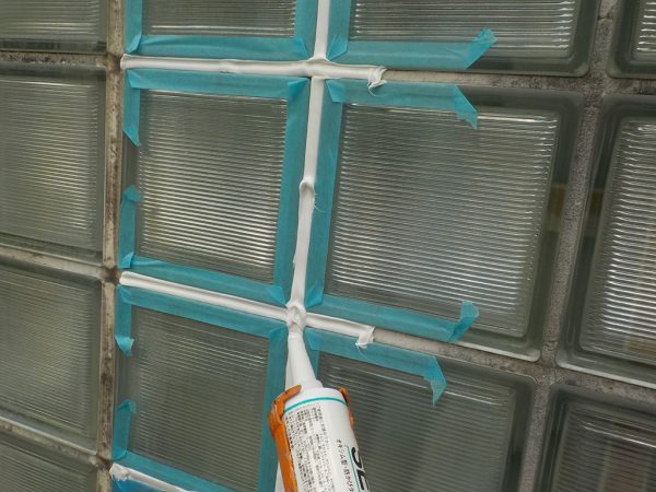ガラスブロック廻りにシールを増し打ちしているところです。