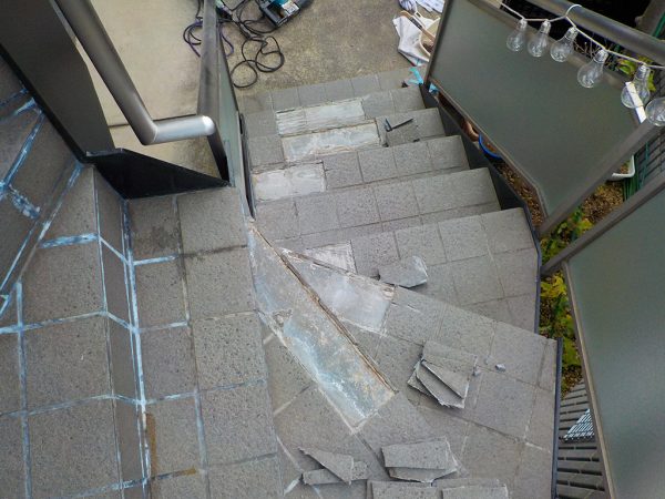外階段の剥がれてきているタイルはすべて剥がしていきます。