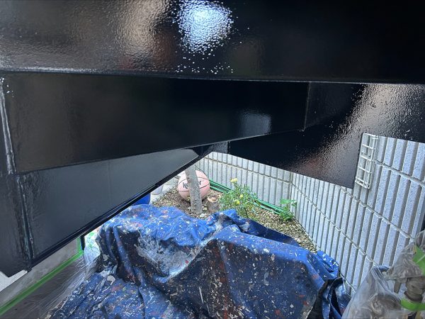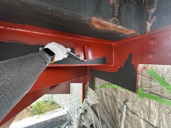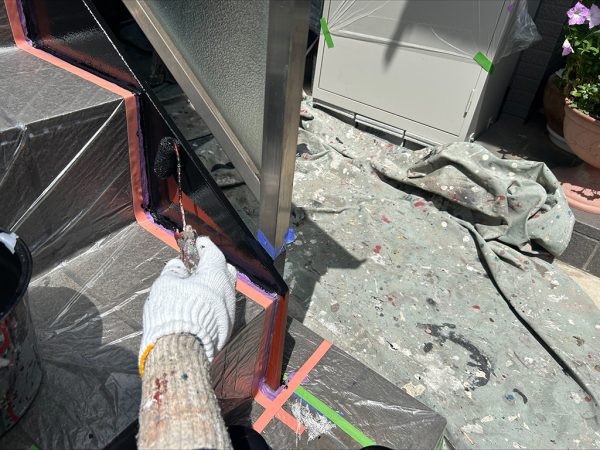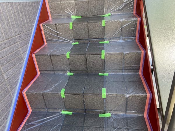 階段部分に養生をして、側面にもサビ止め材を塗布していきます。