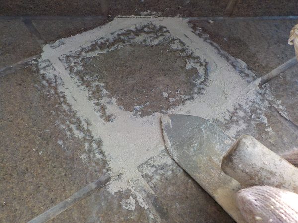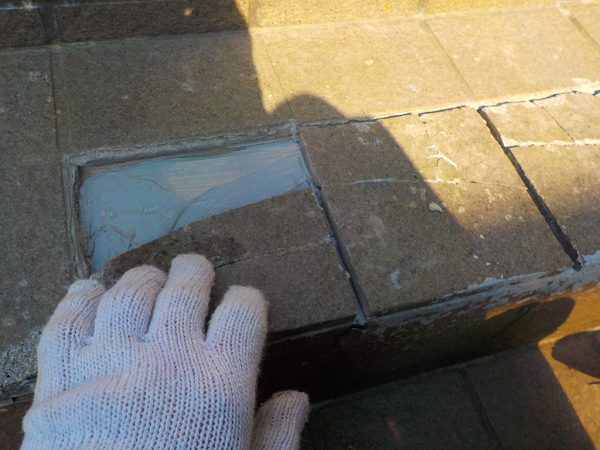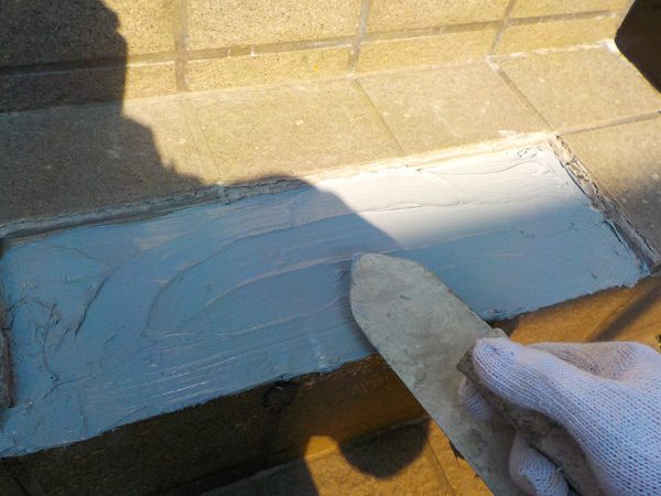タイルを剥がした部分にタイルボンドを充填しているところです。