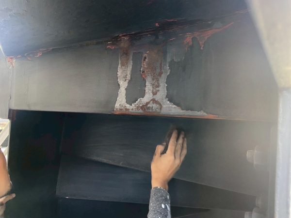 写真の通りサビが発生しているので、やすりなどで削り取るケレンという処理を全体的に実施していきます。