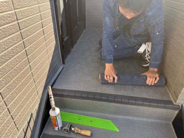 屋外階段で滑りやすいため、滑り止めの溝が深く掘られた防滑シートとノンスリップシートを採用しました。