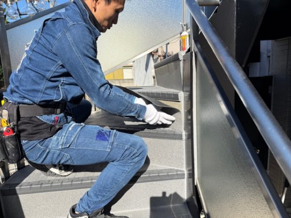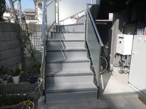 鉄骨外階段のサビと劣化タイルを補修!防滑シート施工で工期・費用を抑える 八尾市