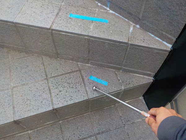これはテストハンマー打診調査をしているところで、タイルの浮きをチェックしています。
